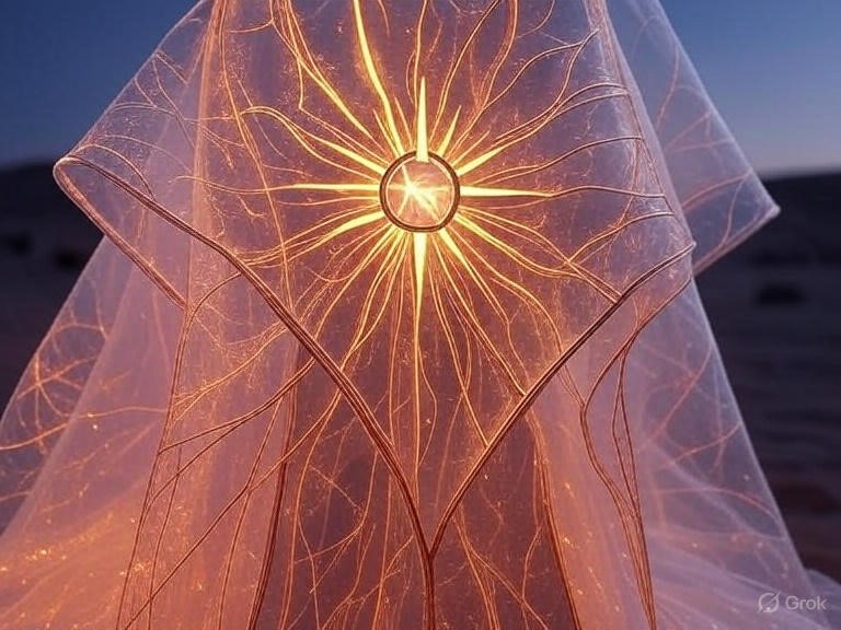 In ritual under sky crack with star, they place pendant, hood, lantern in circle rune etch. Solen chant sun hymn, Nyren whisper twilight veil, Aldaric sing guide beacon. Heat prism burn, mix glass desert with thread twilight, iron enchant frame hold crystal core sunburst. Spark fly golden, hum resonate like earth breath, fabric shift live, warm when energy take, cool when mind shield. Hood born, Radiant Twilight Veil 728, beacon for Unsettled who seek know and strong.