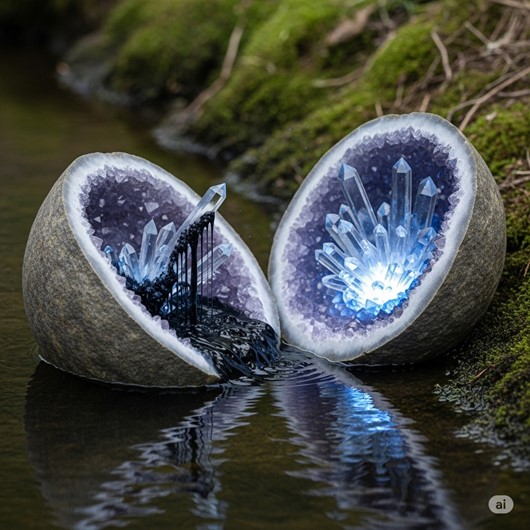 • Sacrifice and Renewal: The geode takes the darkness of the world into itself, sacrificing its own purity to bring cleanliness to its surroundings. Its own need to be periodically cleansed in a place of power symbolizes the essential truth that even healers and protectors must rest and renew themselves, lest they become consumed by the very ills they seek to fight.