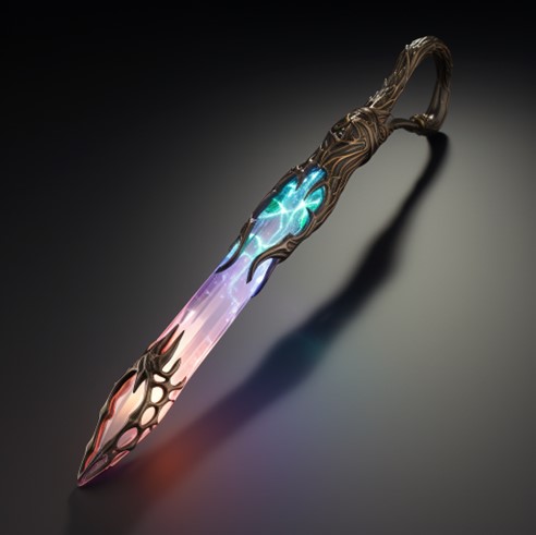 Appearance: A slender, elongated crystal, glowing faintly with shifting colors, mounted on an intricately designed metal handle.