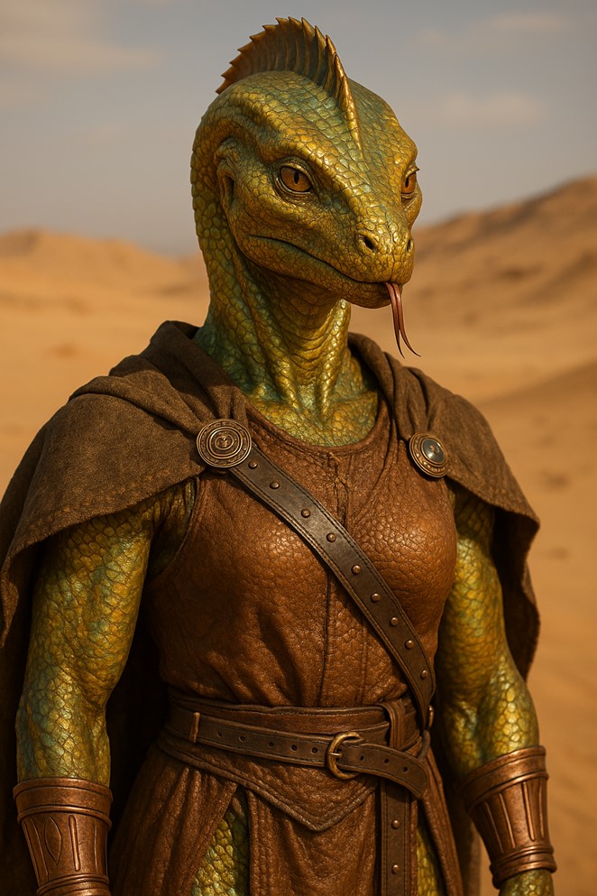 Tags: Reptilian Humanoid, Zaf-Amra, Matriarchal Lineage, Steamcraft Artisan, Desert Geomancer, Ley-Line Attuned, Warm-Blooded, Scaled Body, Gold-Jade Pattern, Sand Engineer, Heat Resistant, Renaissance Industrial, Serene Dunes Heritage, River-Desert Harmony, Gear-Dependent Magic, Subterranean Culture, Royal Descent, Pride and Balance, Magitech Renaissance, Zaf-Amra, Tier-1 Avatar, Steamcraft Engineer, Geomancer, Desert Explorer, River-Desert Unifier, Reptilian Humanoid, Heat Resilient, Ley-Line Savant, Amratian Faithful, Renaissance Industrialist, Golden-Jade Scaled, Matriarchal Noble