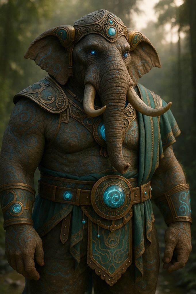Dream-Tusked Nga-Tara average 9 feet tall with massive, rippled hides of deep river-gray or warm clay-brown, patterned in faint, bioluminescent filigree that flares softly when they dream or channel hydromancy. Their tusks spiral slightly outward, etched with luminous Vo-Run sigils inherited at birth; elders often set gold or coral caps at the tips as protective charms. Their trunks end in nimble fingered tips capable of delicate weaving or sudden crushing force. Large fanning ears, veined like river deltas, twitch to distant vibrations — the murmur of ley lines, monsters wading through reeds, or airship rotors far above. Gear tends to be ornate: wide chest harnesses inset with dream-orbs, steam-driven trunk bracers, and ear-pauldrons carved with cresting waves.