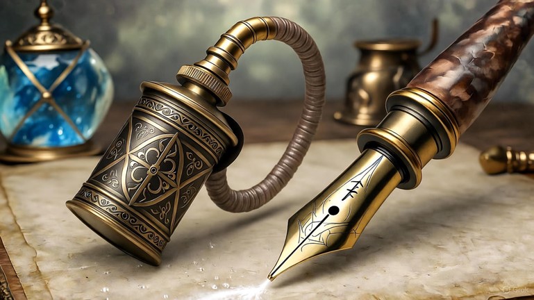 This extra, a bronze canister with dual chambers linked by silk hose to a pearl-tipped stylus etched in familial runes, releases aque-mist for precise inscriptions in Fate Core’s crafting or intrigue scenes, costing 1 refresh to attune and emphasizing rune work in diplomatic or ritual narratives.