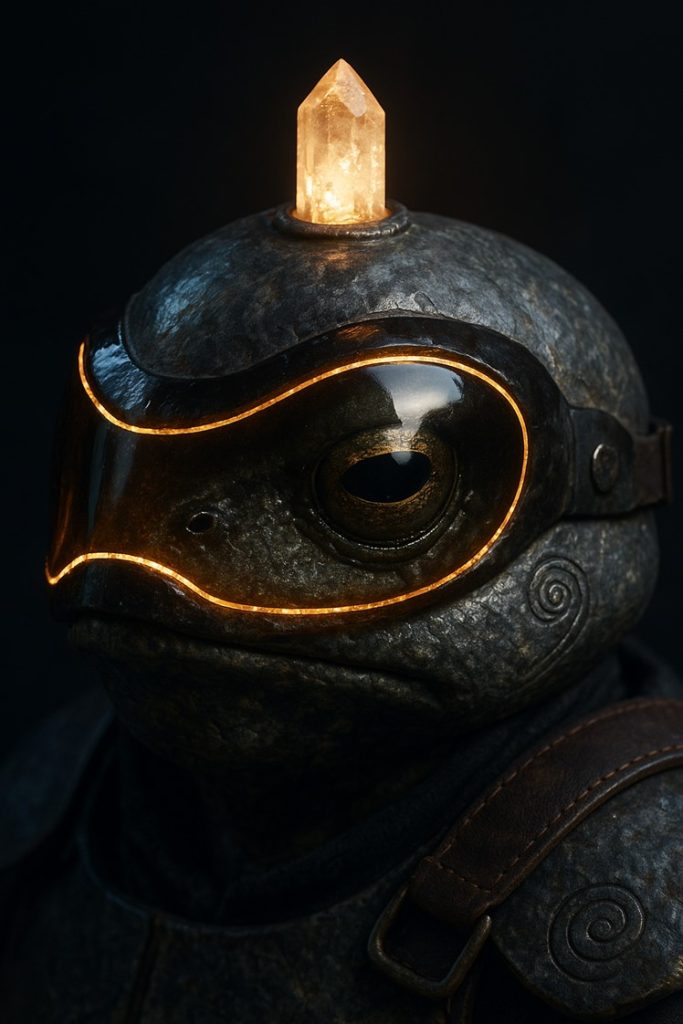 A headpiece carved from volcanic glass, set with a faintly glowing quartz crystal above the brow. The visor frames Veyra’s wide-set eyes without impairing their near-360-degree vision. It hums softly when aligned with ley lines, sharpening her perception of fractures in stone or magical disruptions.