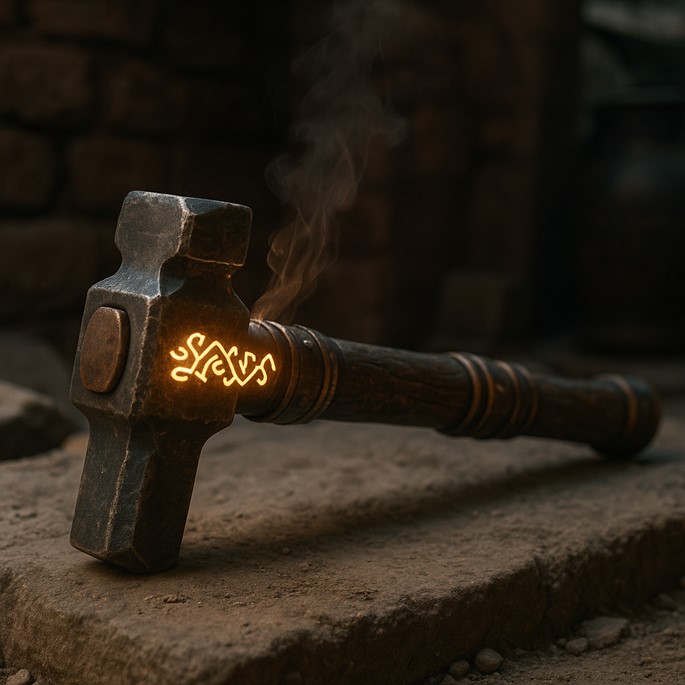 A relic from pre-industrial Saṃsāra, this basalt-and-copper hammer hums in perfect harmony with ley currents. Its rune-etched core resonates through nearby materials, altering the way kinetic energy travels through stone and metal.