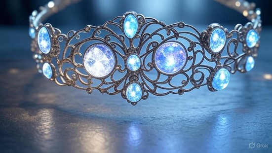 Long did Veyra wander the floating cities and cave depths, her crown aglow with light of blue when truths were sought. In a council vast, where isle lords bickered, she wore the crown, its gems shining to reveal hearts dark with deceit. A magic flow, wild and ancient, stirred and blessed her work, weaving power into the filigree fine. Yet, a voice from the flow spoke, demanding a price: her eyes would dim to fuel the crown’s sight. Thus, the crown bore a burden, its beauty a curse of strain.