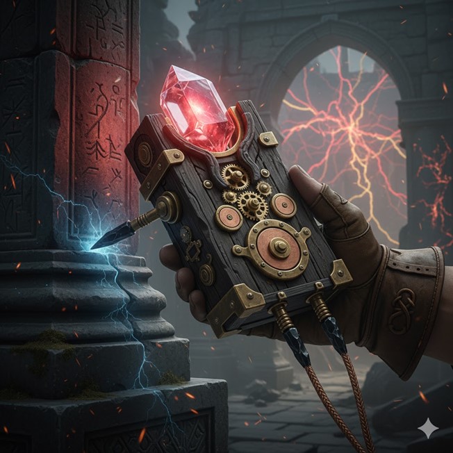 - Resonance Siphon (1 use per long rest): As an action, if the wielder is using Diagnostic Probe on a “Pulsing-Crimson” (Critical/Overload) magical trap or circuit, they can activate the Caliper’s “siphon” function. The Caliper instantly drains the overload-energy, neutralizing the trap or stopping the imminent explosion. The Caliper itself is now “full” and cannot be used again (even its passives fail) until the wielder takes one minute to safely vent the stored energy.