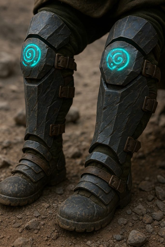Form: Heavy slate-and-steel greaves with glowing geomantic runes.