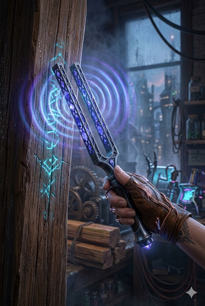 - Tracking via “Harmonic Ping”: In the dense urban “Spire-Cities,” the fletcher roleplays striking the fork against a stone wall to initiate a “Harmonic Ping.” They describe the sensation of the vibration traveling outward and “bouncing” back when it hits specific materials. The fletcher roleplays “hearing” the resonance of a target’s silk cloak or cedar-shafted spears through multiple walls, roleplaying the precise tracking of an enemy’s movement through the vertical labyrinth.