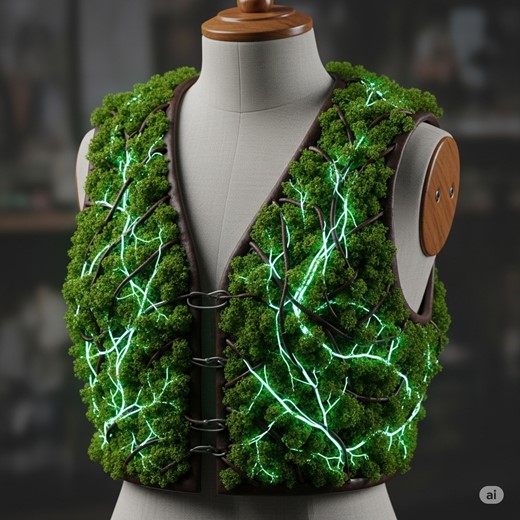 This appears to be a high-fashion armored vest or duster from a boutique eco-designer like Zoé, but matrix scans reveal no technology. It is, in fact, a sophisticated piece of bio-magical craft, weaving living, magically-active flora into a matrix of cured and hardened hide. It offers excellent protection by having the living moss and vines actively absorb and redirect kinetic energy.