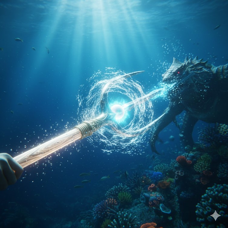 This is where the trident’s elegance becomes lethal. You wouldn’t just say you attack; you’d describe it: “Despite the crushing pressure, the trident feels weightless. I lunge forward with impossible speed, the water offering no resistance.” After striking an enemy, you can use its magic to control their position. You’d narrate the follow-up: “As my tines connect, I call on the pearl’s magic. A blast of pure force erupts from the impact, sending the sahuagin tumbling backward through the water to slam into the coral reef behind it.”