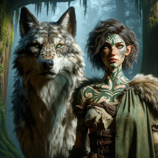 - Formative Years: At the age of 10, Kaelin underwent the Veltarii rite of passage, a sacred ceremony where she bonded with her animal companion, Thalor, a large and intelligent wolf. This bond would become the cornerstone of her identity and abilities as a beastmaster. Throughout her adolescence, Kaelin honed her skills, mastering the art of stealth, tracking, and herbal alchemy under the guidance of her parents and the druidic elders.