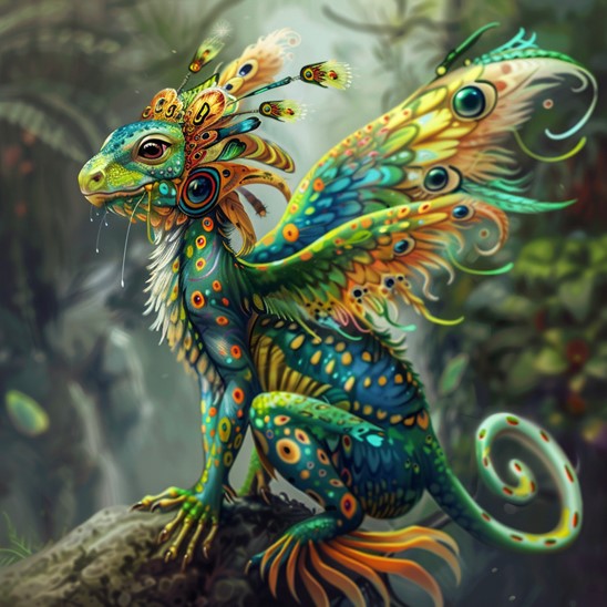 Appearance: Aeroquill is a majestic creature with a slender body and the agility of a snow leopard. It has vibrant plumage resembling the colorful patterns of a peacock. Its skin is smooth and possesses the vibrant hues of a poison dart frog. On its head, it has a pair of compound eyes similar to those of a praying mantis, giving it excellent vision and predatory prowess.