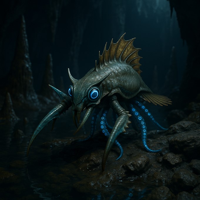 No-Name-Yet-Hollow was born from the quarrel of Water and Stone. Water desired a mirror for starlight; Stone desired a knife for darkness. Neither yielded, so they wed in anger, and the child slid screaming from the seam between them. One fin for Water, one limb for Stone, one eye for seeing, one for hiding, and a hollow drum where a heart should sleep. When it breathed, the stalactites trembled; when it starved, the moon flecked black dust into the well.