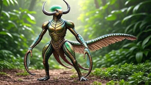The Aurocephaloceratoavis 742 is a striking, chimeric creature that blends features from its four progenitors. Its body is roughly humanoid but covered in a tough, iridescent exoskeleton that shimmers with green, gold, and blue hues, reminiscent of the Resplendent Quetzal’s feathers and the Hercules Beetle’s shell. From its broad, muscular shoulders—derived from the Aurochs—sprout four long, webbed tentacles, each lined with vibrant, translucent membranes like those of the Blanket Octopus. These tentacles are flexible and capable of intricate movements. The head is bovine in shape, with a pair of curved, sturdy horns inherited from the Aurochs, but its face features large, compound eyes inspired by the Hercules Beetle, granting exceptional vision. A flowing crest of quetzal-like feathers extends from the head, cascading down the back. The creature’s lower body tapers into a segmented, insectoid abdomen, ending in a prehensile tail adorned with feather-like filaments.