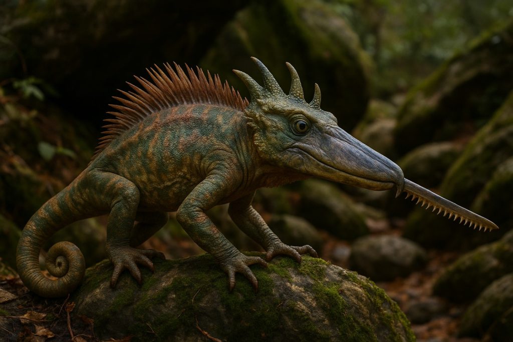 Size: This creature is roughly the size of a large, stout mastiff or a small panther. It stands about 3 feet tall at the shoulder and measures 4 to 5 feet from beak-base to rump, with its saw-rostrum adding another 2 to 3 feet and its tail adding an additional 4 feet when uncoiled. It is dense and powerfully built, weighing between 150 and 200 pounds.