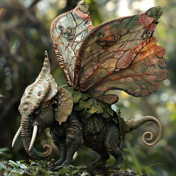 Appearance: The Chamelephantfly is a large creature with the body of an elephant, but the head and tail of a chameleon. It has large butterfly wings that can be folded neatly against its body when not in use. Its skin is scaly and textured like that of a chameleon, with shades of brown, green, and gray.