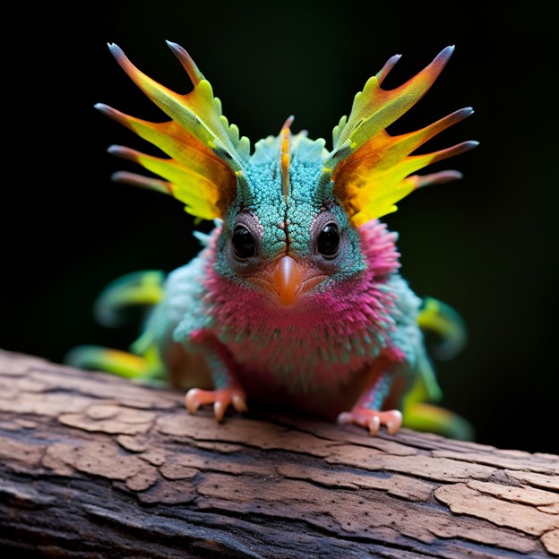 Appearance: Fluffychirp has the body of a bat, covered in soft, fluffy fur, with the color-changing abilities of a chameleon. Its wings resemble those of a parrot, featuring vibrant colors and intricate patterns. Its face combines elements of a bat and a parrot, with a chameleon’s eyes that can move independently. On its back, it sports a series of sensory bristles resembling the hair on a tarantula.