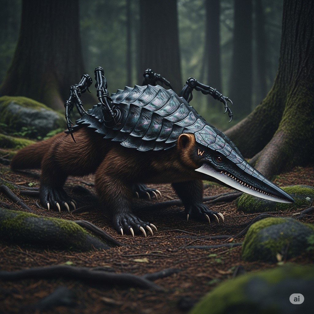 APPEARANCE: The Gulsepidon is a horrifying amalgam of disparate evolutionary paths, resulting in a creature of profound strangeness. Its core body is low-slung, powerfully muscled, and dense, similar to that of a wolverine, covered in a thick, oily, dark-brown fur on its underside and legs. Its back, however, is protected by a segmented, chitinous carapace of iridescent black, much like a beetle’s elytron, that ends in a flexible, turret-like nozzle at the creature’s rear. The most disquieting feature is its skin, which is visible where the fur is sparse. It is a rubbery, chromatophore-rich hide that can shift its color and texture in hypnotic, flowing patterns to match its surroundings, an ability inherited from its cephalopod ancestor.