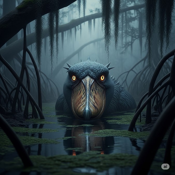 Environment Where Found: The Helocēpiman thrives in murky, cluttered, and wet environments where its ambush tactics are most effective. It is most commonly found in swamps, dense jungles with muddy terrain, mangrove forests, and the marshy floodplains of large rivers. It uses murky water and dense vegetation as cover, often submerging most of its body while leaving only its unsettling eyes and beak visible above the surface.