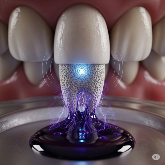 This prosthetic tooth is crafted from a magically reactive mineral composite that analyzes substances on contact. It is a piece of hybrid technology, blending alchemical principles with advanced bio-integration, favored by diplomats and corporate executives in dangerous postings.