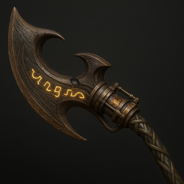 Appearance: A short, curved blade forged from petrified Stonebark, shaped like an oversized rhinoceros beetle mandible, mounted on a lightweight haft of Ghost-Thorn Vine. The glaive is adorned with steam-powered pistons that enhance its swing, powered by elemental water and fire magic, and etched with glowing runes that pulse with a beetle’s territorial vigor.