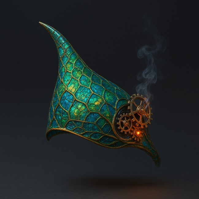 - Appearance: A delicate, iridescent cap crafted from Ghost-Thorn Vine and chameleon scales, molded to fit over Zysskara’s prominent horn. The veil shimmers with shifting colors—emerald, sapphire, gold—mirroring the creature’s exoskeleton, and is adorned with tiny, steam-powered gears that hum softly, powered by elemental water and fire magic.