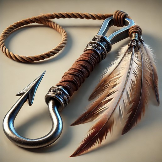 - Perceived: Upon activation, the hook glows faintly with a soft, golden hue that intensifies as it is thrown or latched onto a surface. The eagle feathers on the handle flutter as if catching an unseen breeze, adding an ethereal quality to the movement.