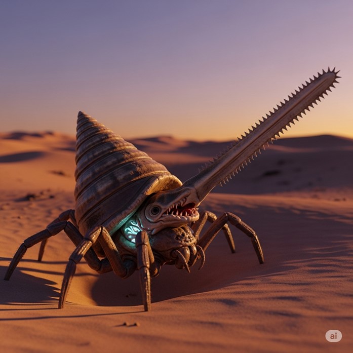 Appearance: The Pristidion 41 is a bizarre and unsettling creature. Its primary body is that of a large arachnid, with eight powerful, multi-jointed legs. Instead of a soft abdomen, a beautiful and ornate conical shell, like that of a giant cone snail, is fused to its back. The creature can retract its legs and head partially into this shell for protection. The front of its cephalothorax is dominated by a long, flat, bony rostrum edged with sharp, tooth-like denticles, identical to that of a sawfish. Its mouthparts are hidden beneath this saw, but a venomous, harpoon-like proboscis can be fired from this area. The creature’s skin, particularly on its legs and underside, is smooth, moist, and semi-translucent like a glass frog’s, revealing the faint, eerie glow of its pulsating internal organs.