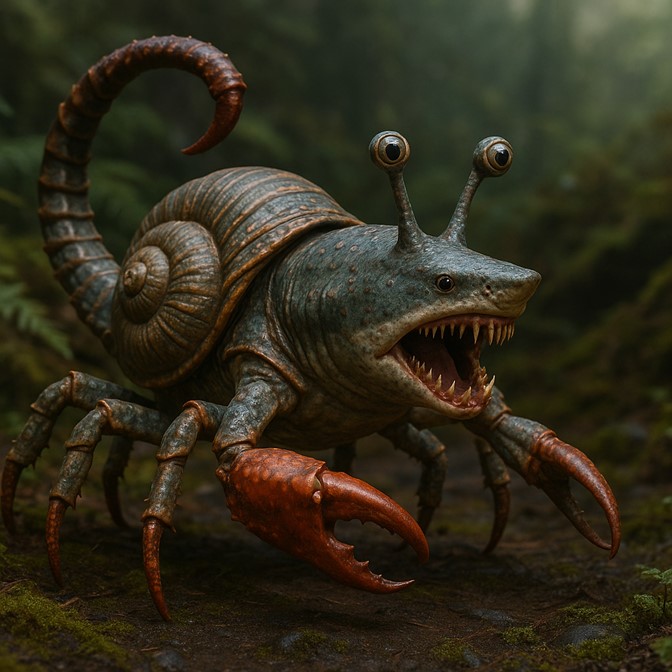 In epochs lost to whispers of sands and waters that flowed backward, when the wadis of Ghassulian hid secrets in depths unplumbed and the skies rained ores not yet forged, there lurked a beast born from the chaos of blends unseen. This creature, etched in plaques half-eroded as the Scorpsnailsharkrab, number forty-two in counts of seers who dreamed in venom’s haze, emerged from the primal mud where gods twisted forms like wires bent. The account, murmured through scribes whose inks faded from speeches older than shells cracked, tells how this feral one, with body of shark’s swift cut and snail’s coil tight, scorpion’s tail curved poison and crab’s claws uneven, stalked the thresholds where waves met stone. The phrases, warped by translations of elders who heard echoes in stings, speak of a predator that guarded the mana flows, its fusion teaching that strengths entwine but imbalance invites the deep’s wrath.