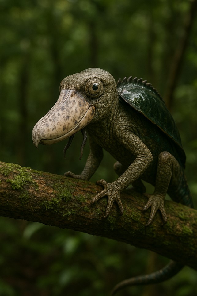 Appearance: The Sepilaceps 77 is a nightmarish fusion of its progenitors. It possesses the quadrupedal, reptilian body plan of a chameleon, with zygodactylous feet (two toes forward, two back) that provide an uncanny grip on any surface. Its back is covered by a hard, chitinous carapace reminiscent of a beetle’s elytra, often displaying iridescent sheens of dark green and black. From its maw sprouts the massive, shoe-shaped beak of a shoebill, a formidable weapon of bone-colored keratin marked with greyish splotches. On either side of this disproportionately large head are two independently rotating, turret-like eyes that allow it to look in two directions at once. Two small, highly dexterous tentacles, like those of a cuttlefish, emerge from just below the beak, constantly tasting the air. Its skin is its most remarkable feature: a network of chromatophores allows it to change not only its color but its texture and reflectivity in seconds, shifting from smooth and wet to rough and bark-like, granting it near-perfect camouflage.