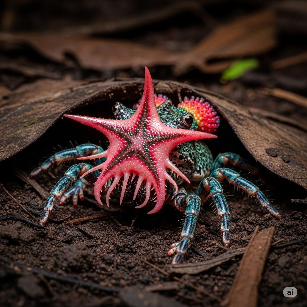 Other Interesting Information The Starnose Chameleofrog Spider utilizes two distinct forms of poison. Its bite injects a potent, fast-acting neurotoxin that does not kill but induces rapid paralysis, completely immobilizing prey within seconds. This allows the creature to safely drag its victim into its lair without a struggle. The second poison is a passive defense, a brightly colored mucus secreted from the skin on its back. This toxin is not venomous but is highly poisonous if ingested, causing violent sickness and death to any predator that might try to eat it. The creature can “flare” the colors of this mucus as a vibrant warning display.