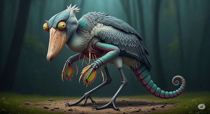 Appearance The Stomatoleo-Bombardeus is a bipedal monstrosity that embodies a terrifying fusion of its progenitors. It stands in a hunched, predatory posture reminiscent of a shoebill stork, supported by two powerful, digitigrade legs that end in sharp talons. Its body is not covered in scales or feathers, but in a thick, iridescent carapace of chitin, segmented like an insect’s exoskeleton. This carapace possesses the chromophoric properties of a chameleon’s skin, allowing the creature to shift its color and pattern with startling speed to perfectly match its surroundings, from the dappled light of a jungle floor to the slick grey of wet stone.