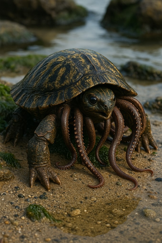 The Strangulvirex 612 is a broad, low-slung creature whose domed carapace resembles the weathered shell of a green sea turtle but is overlaid with the thick, mottled chitin of a Goliath beetle, patterned in interlocking black and bronze stripes. Its four primary limbs are the thick, armored legs of a mangrove crab, each ending in shovel-like claws with a serrated inner edge, ideal for digging and cutting. From beneath the shell emerge six long, muscular octopus tentacles, each covered in short suction cups ringed with keratin spikes, allowing them to grip both prey and terrain. Its head is recessed beneath the front lip of the carapace, bearing large, forward-facing compound eyes with a glossy obsidian sheen and a sharp, beak-like mouth for shearing through shells or tough plant matter. When alarmed, its tentacles retract tightly, and the entire body withdraws partially beneath the beetle-armored shell, presenting only the heavily plated crab limbs as a defensive front.