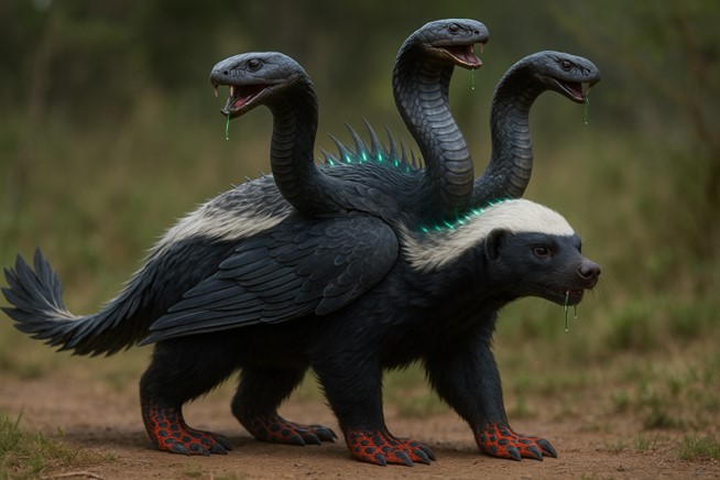 Appearance: The Thornwing Hydra 589 is a ferocious hybrid, its form a testament to Saṃsāra’s wild magical fusion. Its body is covered in the coarse, black-and-white fur of a honey badger, interwoven with the sleek, dark feathers of a harpy eagle along its back and wings. Three serpentine necks, each tipped with a king cobra-like head bearing hooded eyes and venom-dripping fangs, extend from its broad shoulders. Its legs are stout and powerful like a badger’s, but its feet are webbed and speckled with the bright red-and-black patterns of a poison dart frog, hinting at its amphibious roots. A row of thorn-like spines runs down its spine, glowing faintly with magical energy, and its tail ends in a feathered, eagle-like tuft that sways menacingly.