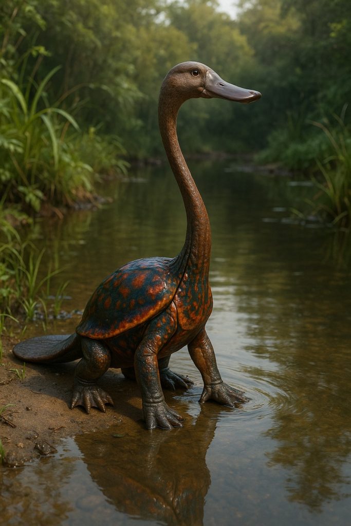 Her heart heavy, Ilyana walked away from her village. She went to the wide, wet marshes down by the river, a place of soft mud and buzzing flies where others did not go. She sat by the water’s edge, her mind as murky as the pool before her. And then she saw it. A thing of impossible shape. A creature with a shell like a beetle, a tail like a beaver, and a great, long neck like a serpent made of joints. The creature hid in the water, only its head showing, its flat, duck-like bill resting on the surface.