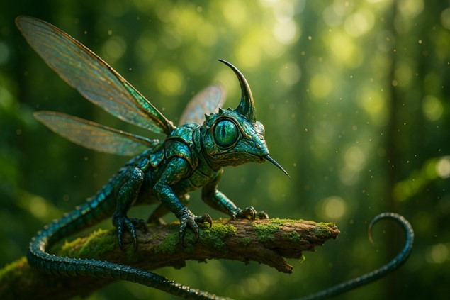 Behavior: The Viperscale Skimmer 742 is a solitary yet curious creature, driven by a gestalt consciousness that blends the instincts of its progenitors into a singular, sentient will. It flits through the forest canopy with hummingbird-like bursts, hovering to observe its surroundings with chameleon-like caution, its multifaceted eyes scanning for threats or resources. When foraging, it mimics the chameleon’s deliberate precision, using its prehensile tail to pluck safe fruits or insects while avoiding poisonous flora, guided by the pouch-like magic of its exoskeleton. Its beetle-inspired strength allows it to defend itself with powerful horn-thrusts or mandible-bites when cornered, though it prefers to evade danger with its cloaking abilities or gliding escapes, reminiscent of the flying fish. The Skimmer is fiercely territorial, marking its grove with bioluminescent secretions that glow faintly at night, a warning to other creatures. Despite its feral nature, it exhibits a playful curiosity, often trailing adventurers or villagers, drawn by their pouches’ magic, seeking to learn or trade knowledge through its Mind’s Eye.
