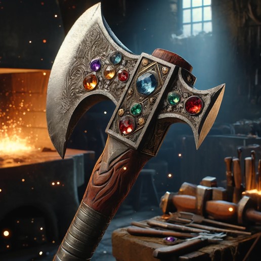 - Description: A battle axe with a blade embedded with precious gemstones that glow with elemental energy when activated. The haft is made from reinforced stone for strength and balance.