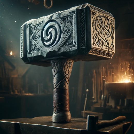 - Description: The runes emit a soft, amber glow that pulses rhythmically, giving the hammer a mystical appearance. The stone of the hammerhead shimmers slightly, reflecting the magical energy contained within.