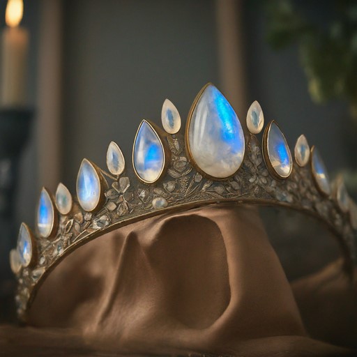 - Sight: The tiara shimmers with an ethereal light, its moonstones casting a soft, iridescent glow that dances around the wearer’s brow. The intricate silverwork and delicate curves of the circlet are highlighted by the interplay of light and shadow.