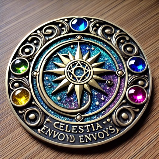 The badge worn by Celestia Envoys consists of an intricate circular emblem with celestial motifs and enchanted gems. The badge’s design represents the faction’s emphasis on harmony and exploration.