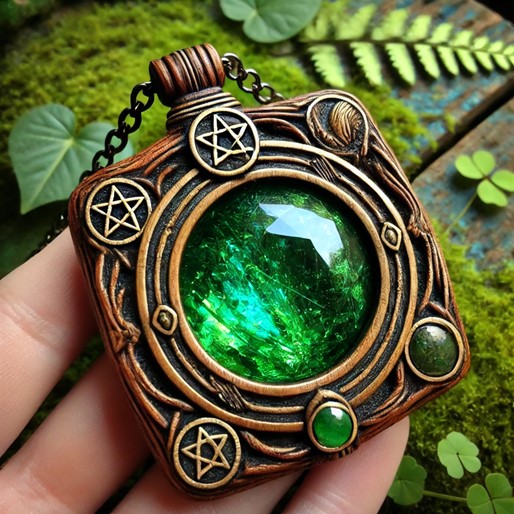 Description: The Verdant Veil Amulet is a round, handcrafted amulet made from a translucent, green-hued gemstone that seems to shimmer with inner light. The gemstone is encased in a finely carved wooden frame, adorned with symbols representing the cycles of life and the natural world. The amulet hangs from a sturdy yet delicate chain, designed to rest gently against the wearer’s heart.