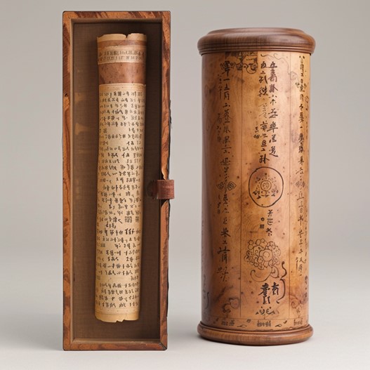 Description: The Lyric Scroll of Appraisal appears as an intricately designed parchment scroll, adorned with elegant calligraphy and miniature illustrations that mirror the themes of the ballad. The scroll is encased within a cylindrical container made from a polished wood, engraved with symbols representing appraisal and knowledge.