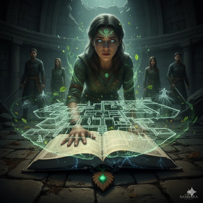 Roleplay: The caster places their hand on the Almanac and chants, their eyes rolling back and becoming milky white. Their perspective crashes down into the dirt, feeling the cool press of soil and stone. They don’t just “see” a 3D map; they perceive it. They feel the scuttling of insects, the slow creep of roots, and the hollow emptiness of a hidden tomb, all as a single, overwhelming sensory input.