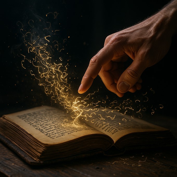 The caster brushes a fingertip across the page, creating a tone that is half chant, half tuning fork. Visible enchantments begin to fray at the edges, unraveling into drifting phonetic runes that fade like dandelion seeds on invisible wind.
