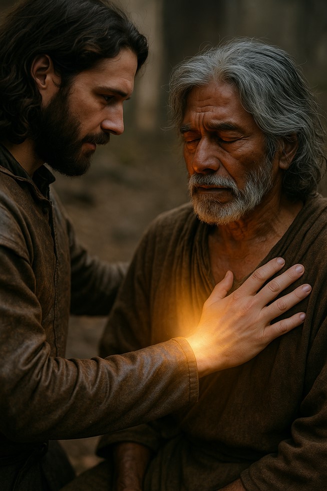 It was told he once came upon a great warrior, face twisted with fire-anger, gripping an enemy by the throat. This warrior, whose name in forgotten tongues meant “Breaker of Oaths,” was ready to crack the world with fury. The Calmer approached and spoke a single phrase, soft as grain falling in a sack. His hand touched the warrior’s shoulder like a feather sleeping. In the same blink, the anger fell from the warrior as if it were a stone that no longer wished to be lifted. The enemy was released. Both stood breathing, confusion at first, then slow understanding.