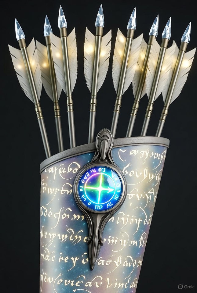 Type: Extra (Stunt-Granting Artifact) Description: This ethereal silver quiver, glowing with inscribed verses and a prismatic rune-etched amulet clasp, holds twenty shimmering arrows that hum with transcendent energy. It embodies archery mastery fused with spiritual enlightenment and luminescent detection, ideal for characters pursuing heroic ascendance in narrative-driven tales. Mechanics: As an extra, it provides aspects and stunts for archery, detection, and social harmony; balanced for mid-campaign with fate point invokes to encourage dramatic moments. Compels possible for overreliance (e.g., drawing unwanted cosmic attention).