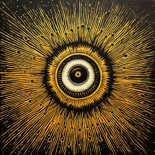 Graphic Appearance: The symbol takes the form of an intricately detailed eye, surrounded by a pattern of radiating lines that resemble sun rays. However, upon closer inspection, these lines turn into tiny, written script detailing ancient wisdom related to mindfulness and perception.