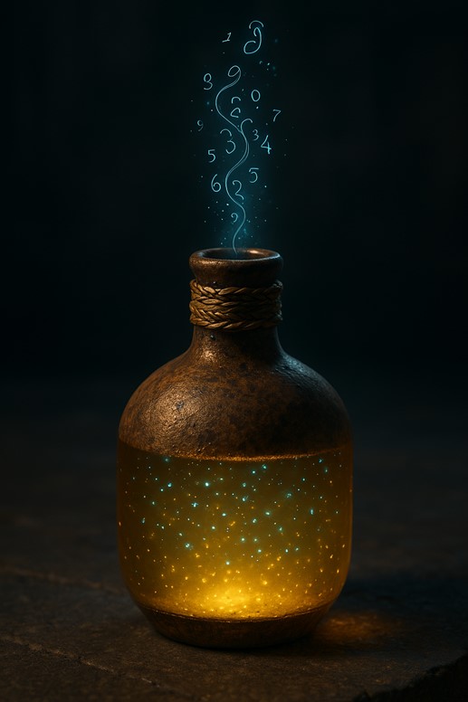 Description: A squat clay bottle sealed with braided reed and wax. When unstoppered, whisper-thin glyphs of shifting numerals spiral up the neck before dissolving. The liquid is clear amber shot through with pale teal motes that drift like suspended grains of sand; each mote pops in a tiny shimmer when the brew is swirled. The flavor begins sweet—honey and dried peach—then narrows to a dry, chalk-tinged finish reminiscent of ledger dust.