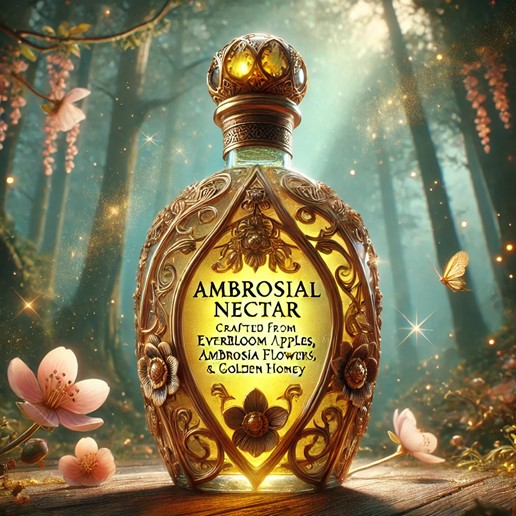 Process: The alchemist or herbalist begins by selecting Everbloom Apples that exude a vibrant and robust energy. The petals of the ambrosia flower are meticulously collected, ensuring their freshness and potency. The golden honey is obtained from enchanted hives, where the magical bees produce honey infused with their life force. The ingredients are combined with precise measurements, allowing their natural properties to blend synergistically. The mixture is subjected to a delicate alchemical process, involving gentle heating, cooling, and infusion. The resulting nectar is carefully strained and stored, ready to be savored.
