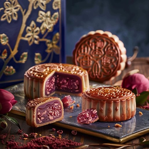 • Perceived: Golden-brown, intricately designed mooncakes with a glossy sheen and a vibrant, colorful filling.